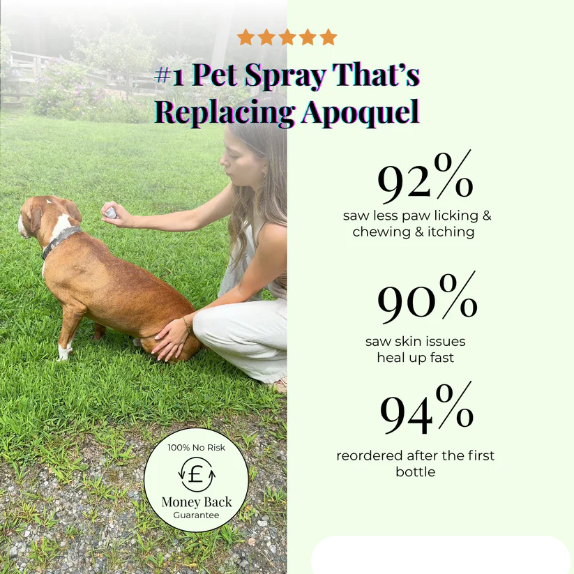 DermaPup Relief Mist can be a gentle, natural alternative for many pets. Instead of blocking immune signals, it soothes irritation on the surface and supports healthier skin from the outside in.